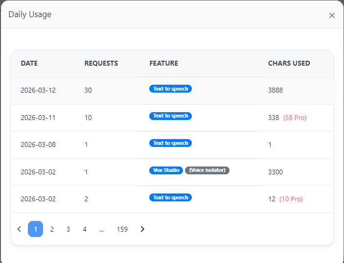 You can navigate through the pages using the pagination feature to view your complete character usage history from the date you joined Voicemaker and started a paid plan.
