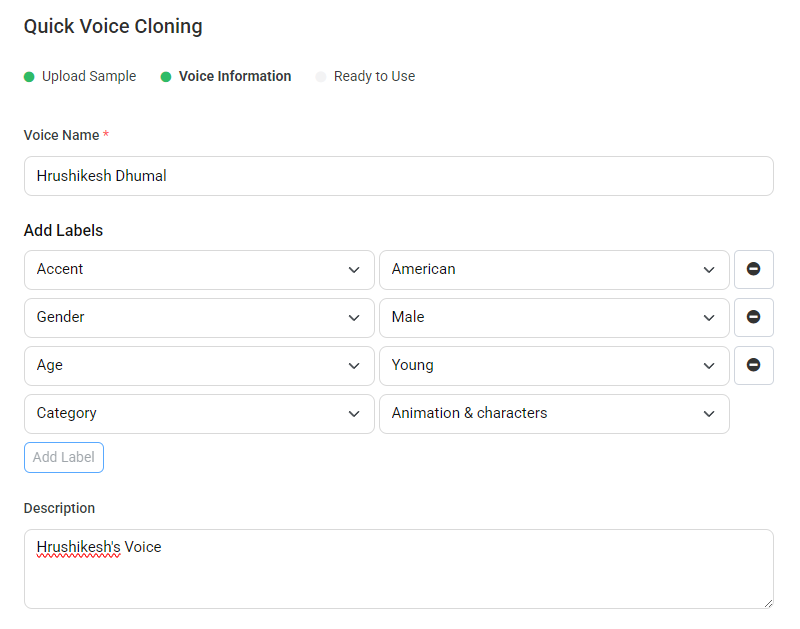 Step 4: On the 'Voice Information' page, fill in the following fields such as Voice Name, Category and Labels, Description about the voice