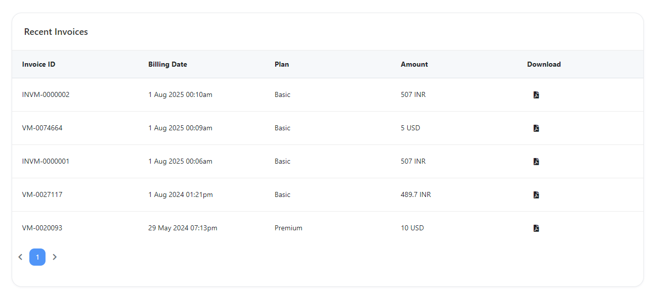 Step 3: Scroll to the bottom of the page. Here, you’ll see a table displaying the invoices for all your purchased plans.