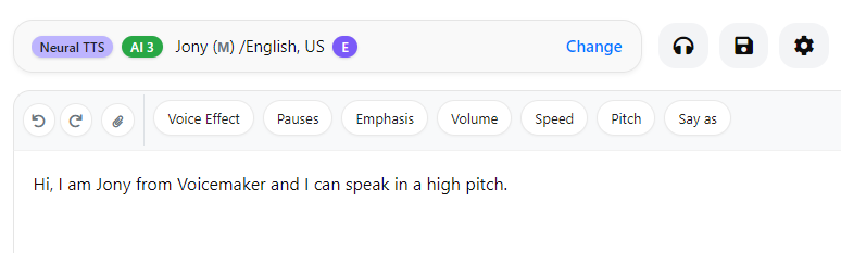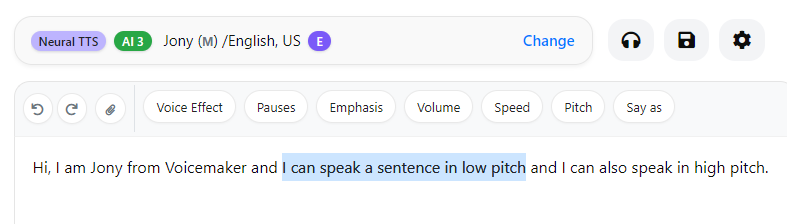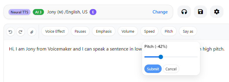 - Change the pitch for the entire text using Voice Settings.