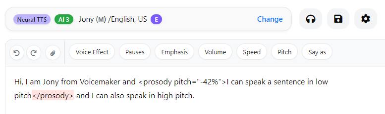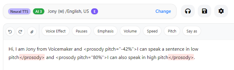 Pitch adjustments through SSML are intentionally subtle. Applying very high or very low pitch values can distort the voice and affect audio quality, so moderate adjustments are recommended for the best listening experience.